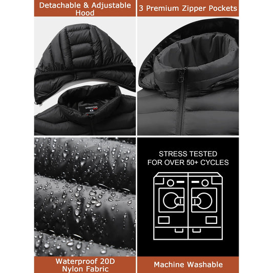 Unisex Heated Jacket with Battery Pack 7.4V, Winter Heated Coat for Women and Men, 6 Heating Zones, Detachable Hood (Black, XS)